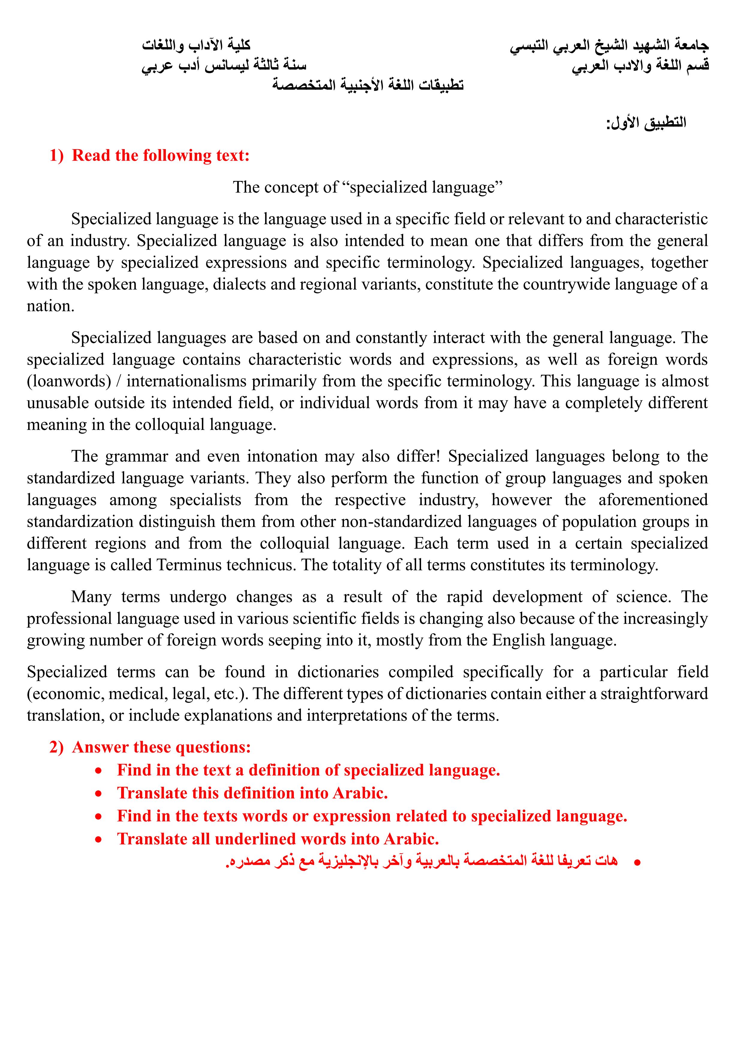 مجموع تطبيقات مادة لغة أجنبية  متخصصة لطلبة السنة ثالثة ليسانس أدب عربي