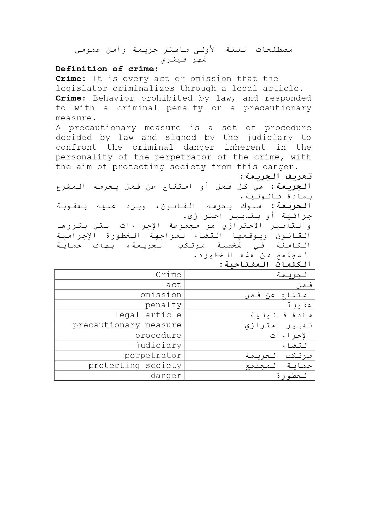 مصطلحات السنة الأولى ماستر جريمة وأمن عمومي
