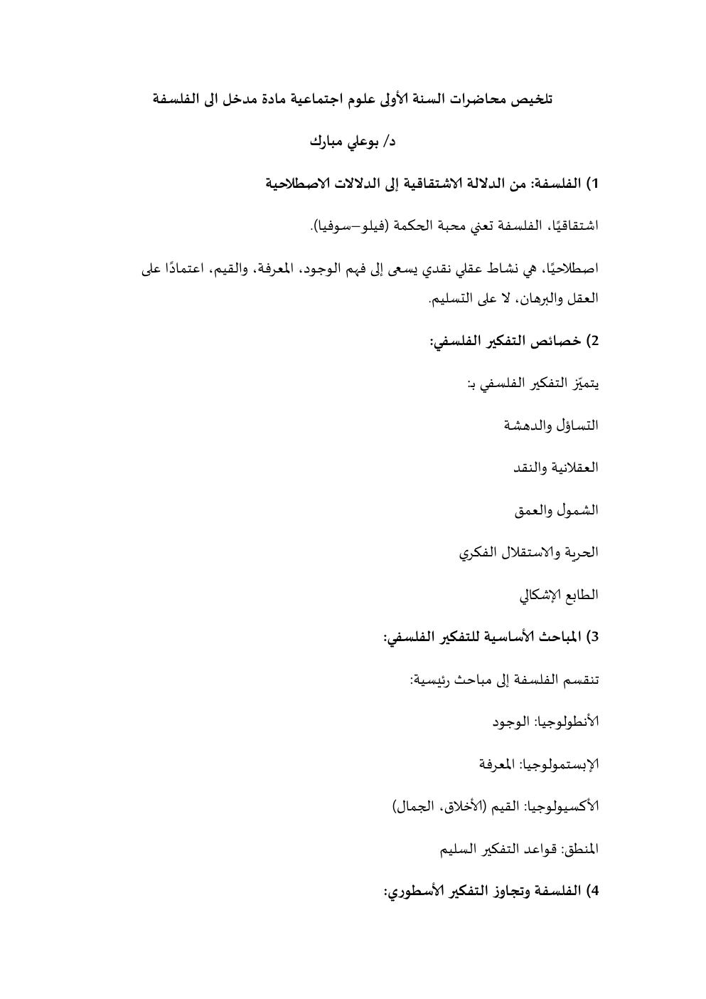 ملخص محاضرات السنة الاولة علوم اجتماعية مدخل الى الفلسفة1