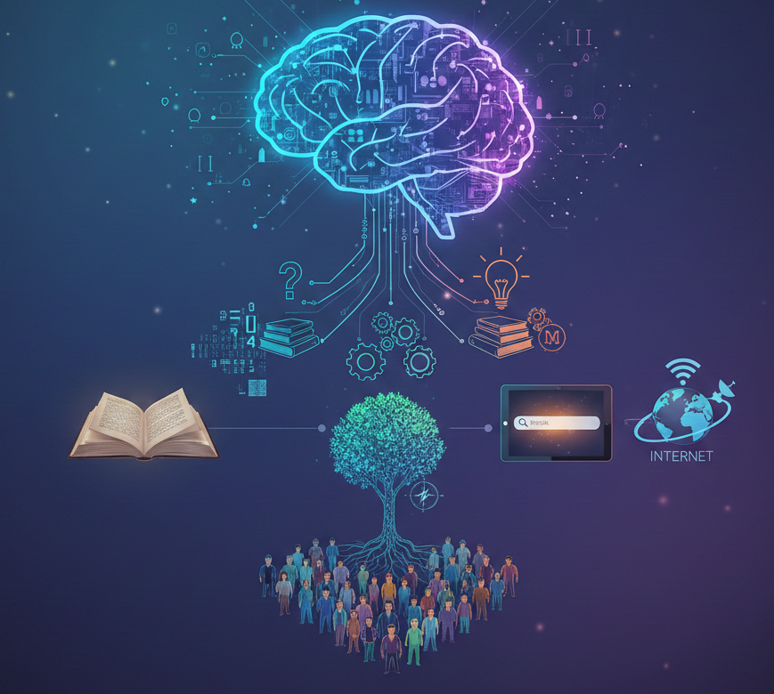 • الإنترنت (شبكة الشبكات): دراسة الإنترنت ليس فقط كأداة تقنية، بل كبيئة حاضنة للمعلومات وبنية تحتية أساسية ألغت الحواجز الزمانية والمكانية أمام تدفق المعرفة.