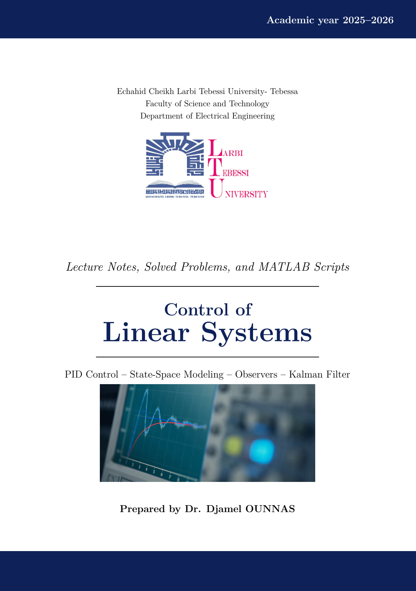 These lecture notes present essential methods for the analysis and control of linear systems, including frequency-domain design of PID controllers, state-space modeling, observers, and the Kalman filter. They combine theoretical foundations, solved problems, and MATLAB implementations to provide a comprehensive learning resource for students and practitioners in control engineering. They also serve as a consolidation of previously acquired knowledge, with a focus on mastering the representation of dynamic systems in state space, understanding their fundamental properties, and acquiring key methods for analysis and control synthesis. This course is intended primarily for third-year undergraduate students in Automation and Electrical Engineering. It is also suitable for learners who wish to acquire the fundamental concepts of linear systems control in general.
