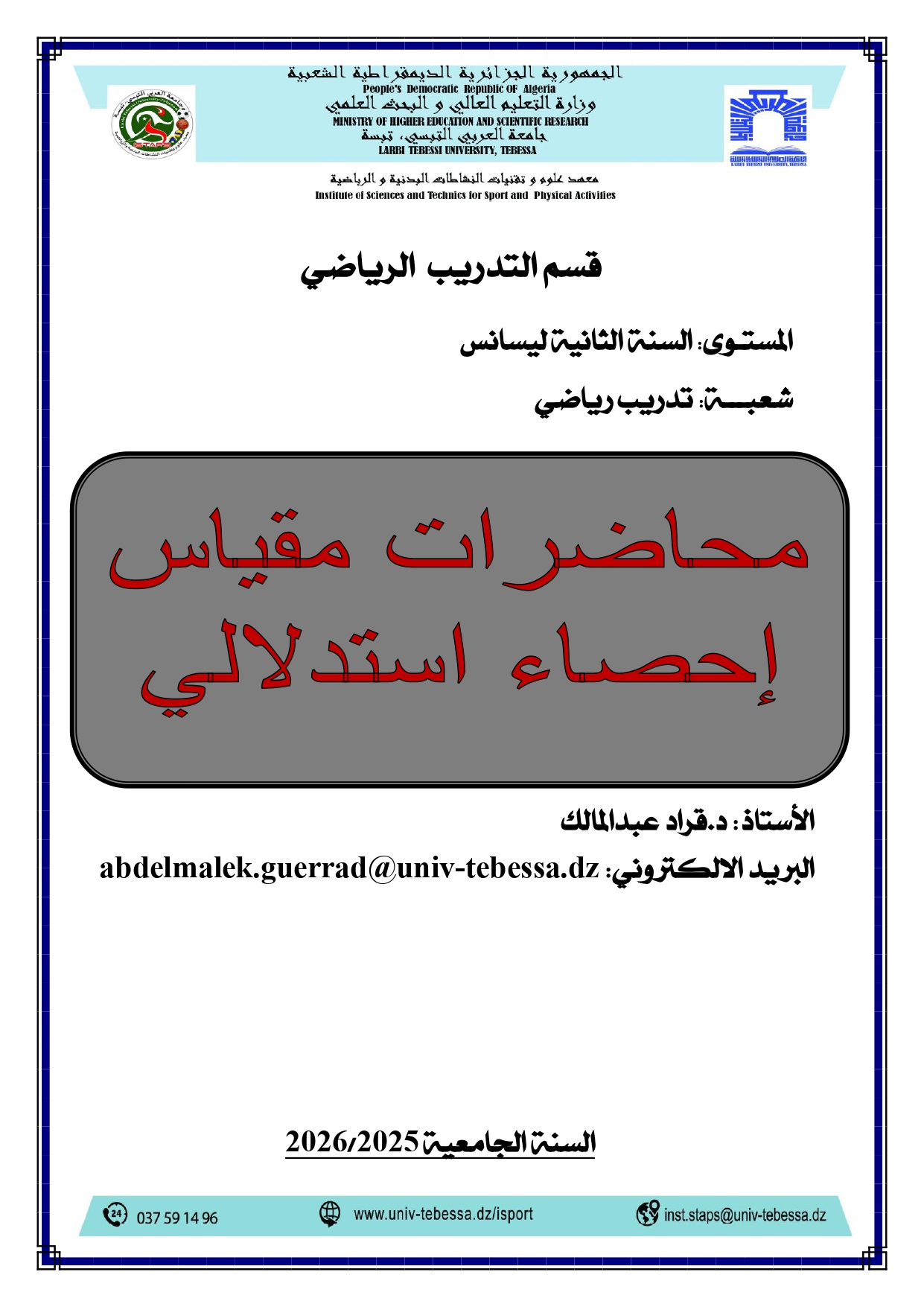 مقياس الإحصاء الاستدلالي موجه لطلبة السنة الثانية ليسانس شعبة تدريب رياضي، حيث أن مقياس الإحصاء الاستدلالي من بين مقاييس السداسي الثالث لهذا سنحاول فيه التطرق الى مجموعة من العناصر والتي تندرج ضمن ماهو مقرر لطلبة في مقياس علم الاجتماع الرياضي وهي: التبياين، الانحراف المعياري، معامل كا مربع، معامل الارتباط بيرسون، معامل الارتباط سبيرمان، ت ستيودنت